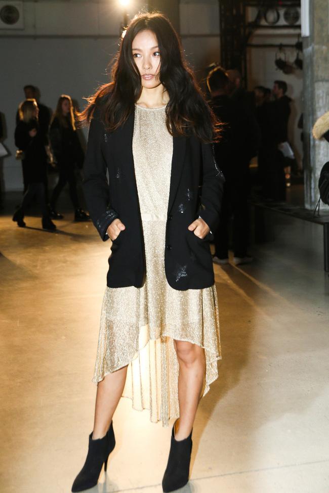 Cũng giống như Yoona, Lee Hyori cũng chọn áo blazer đen cho set đồ của mình khi đi xem show thời trang. Nữ ca sĩ mix đồ đơn giản: áo blazer cùng váy liền ánh vàng nổi bật, toát lên khí chất của một Diva hàng đầu K-pop.