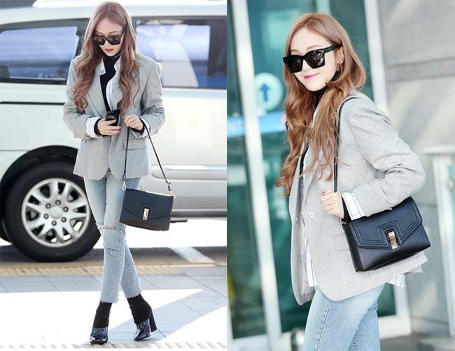 Hình tượng sang chảnh, có phần nam tính của Jessica luôn giúp cô tỏa sáng mỗi khi xuất hiện tại sân bay. Người đẹp kết hợp layer áo cổ lọ, sơmi và áo vest xám. Set đồ của Jessica đủ giữ ấm, trông gọn gàng, tiện dụng.