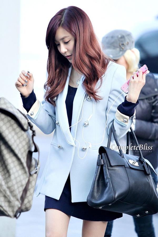 Tiffany vẫn trung thành với style điệu đà nữ tính khi kết hợp blazer xanh pastel cách điệu cùng váy len mỏng.