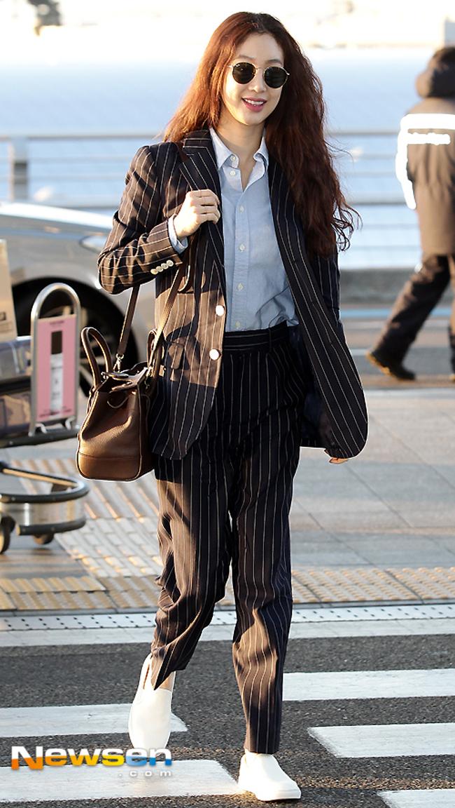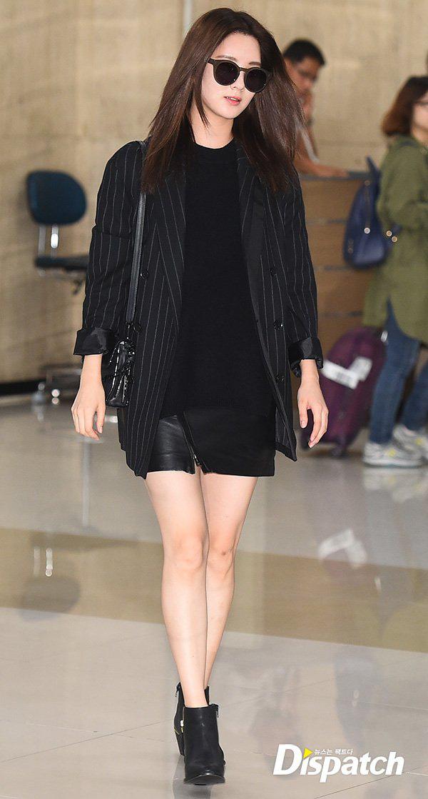 Em út Seo Hyun luôn là thành viên chăm chút ngoại hình. Cô nàng dạo bước ở sân bay trong style sang chảnh với blazer kẻ sọc và một set đồ nguyên sắc đen, đơn giản mà không hề xuề xòa.