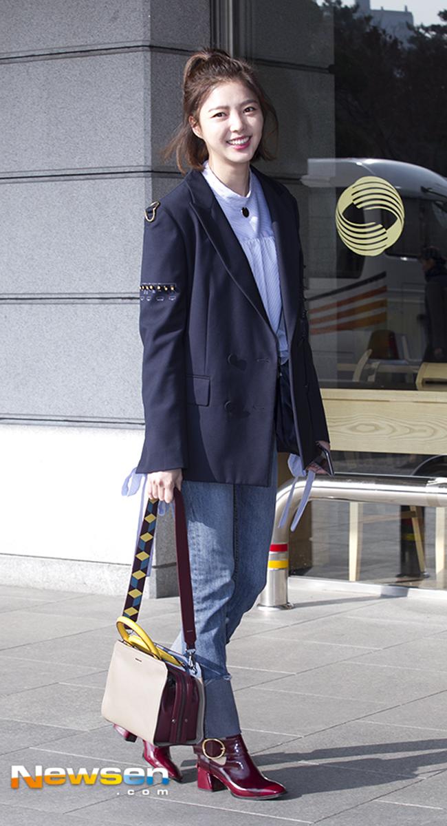 Uhm Hyun Kyung trông tươi trẻ hơn hẳn độ tuổi 30 khi diện áo blazer cùng quần jeans và những phụ kiện tông màu bắt mắt.