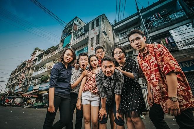 Các bạn trẻ hóa thân thành cô cậu sinh viên của những năm 90 ở Sài Gòn, mặc áo nhiều màu sắc.