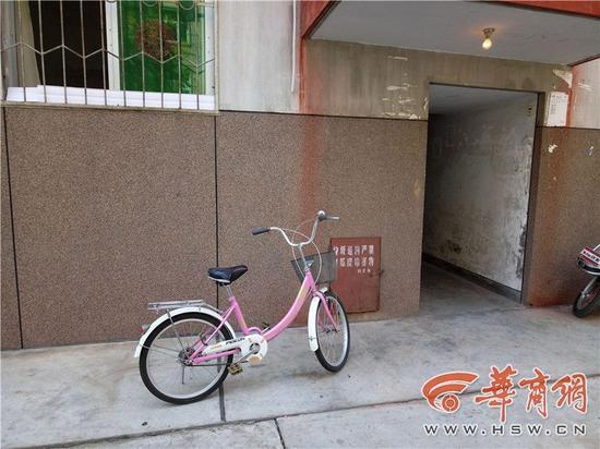 Chiếc xe đạp của cô con gái chị Mã dựng trước cửa vào chung cư.