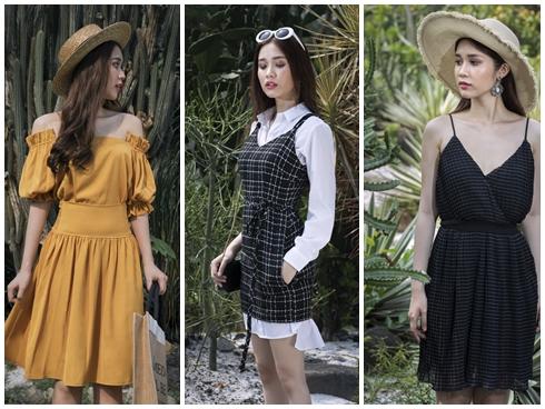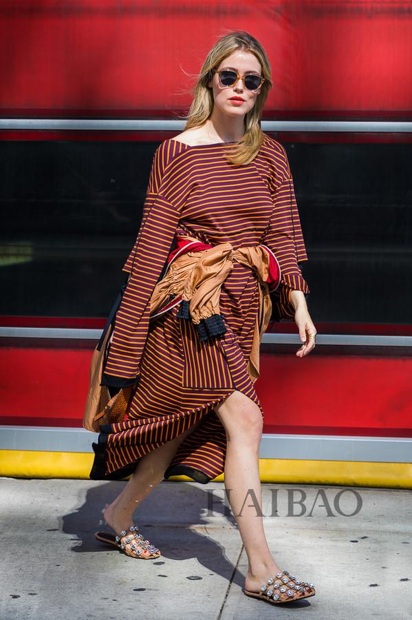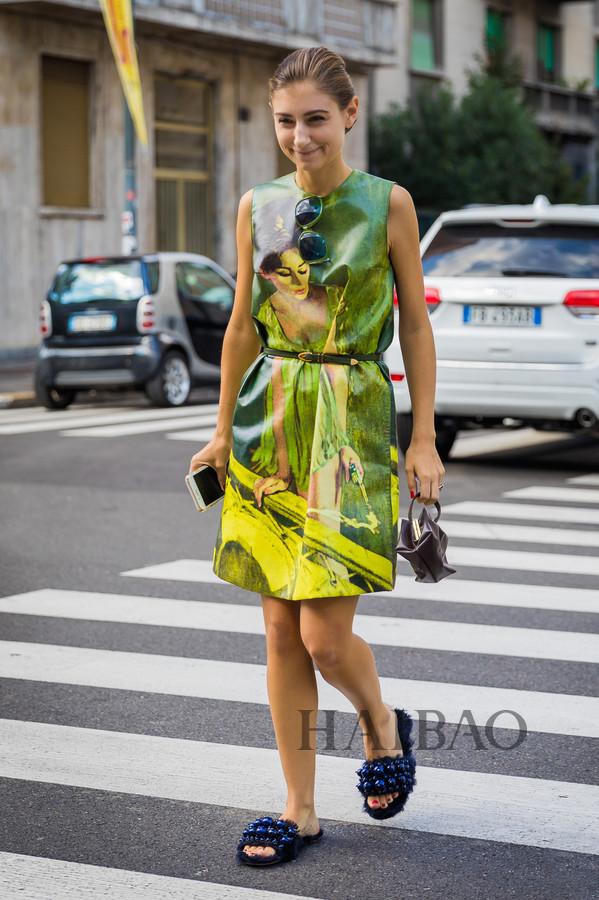 Một chiếc váy thắt eo duyên dáng kết hợp với dép lê đính lông, hạt cườm, kèm theo túi xách tinh tế, là set đồ chuẩn và nhanh gọn khi bạn cần xuống phố.