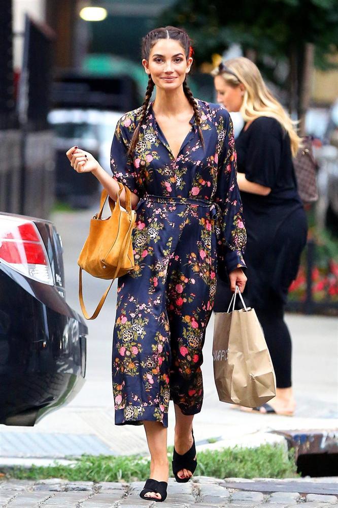 Còn gì thời thượng, nữ tính hơn bằng việc kết hợp dép mules cao gót cùng mẫu váy lụa in hoa như Lily Aldridge. Mái tóc tết cầu kỳ bổ sung thêm nét duyên dáng cho toàn set đồ.