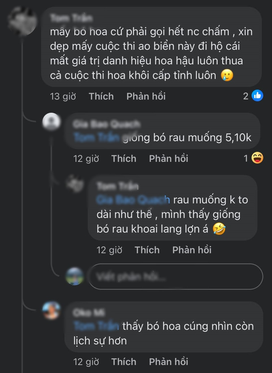 Bên cạnh vương miện và giải thưởng có tổng giá trị 2 tỷ đồng thì bó hoa lại bị chê cực phèn. Trong hình, có thể thấy, bó hoa khá héo, sơ sài, không được bóc giấy cẩn thận. Dưới loạt ảnh khi Thanh Thảo đăng quang, nhiều người để lại bình luận chê bai: "Sao nhìn bó hoa cứ ngỡ bó rau lợn vậy, chán đời", "Giống bó rau muống 5 -10k", "Thấy bó hoa cúng còn lịch sự hơn"...