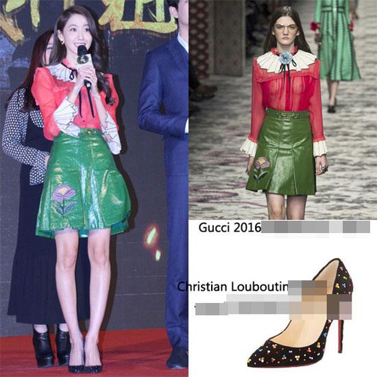 Bộ trang phục sắc màu của hiệu Gucci xuân hè năm 2016 được cô mix cùng đôi giày