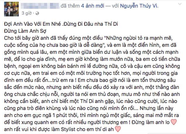 Đêm ngày hôm qua, đồng loạt những dòng status và chia sẻ đầy lo lắng, hoang mang của bạn bè Thuý Vi vì không thể liên lạc được với cô nàng đã làm dấy lên tin đồn Thuý Vi gặp chuyện không hay. Đến trưa ngày hôm nay, stylist và cũng là một người bạn khá thân của Thuý Vi đã lên tiếng xác nhận, việc cô nàng tự tử trong phòng tắm và hiện hôn mê.