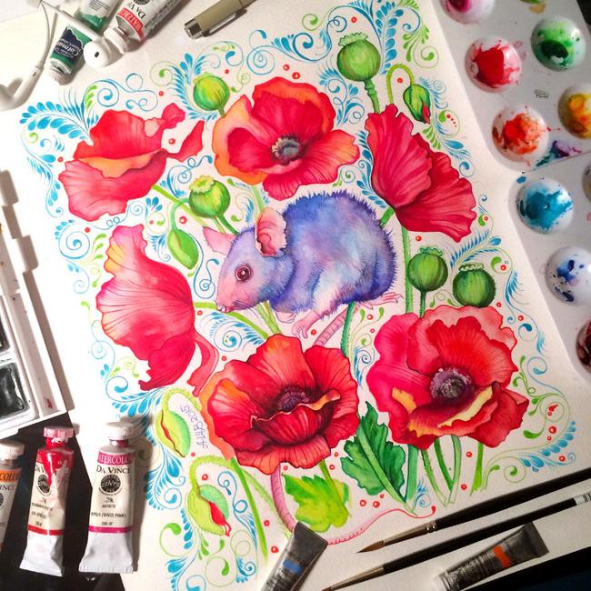 Mười hai con giáp, một nét văn hóa truyền thống của các nước phương đông, lại có thể truyền cảm hứng cho cô nàng họa sĩ đến từ Toronto, Canada. Anna Bucciarelli đã tái hiện hình ảnh mười hai con giáp theo một cách mới lạ chưa từng có và cho ra đời bộ sưu tập tranh màu nước long lanh. Những con vật quen thuộc lạc vào khu vườn thần tiên, được bao quanh bởi những đóa hoa rữc rỡ.