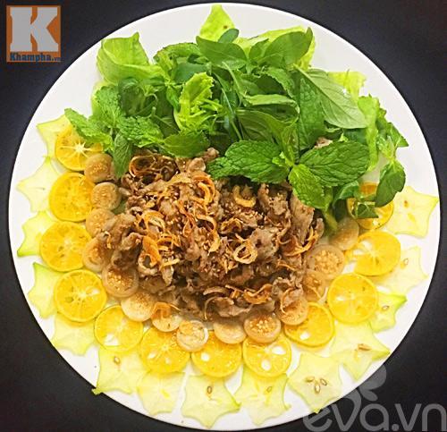 - Xếp các nguyên liệu, rau thơm, tắc, khế, cà pháo, thịt bò ra đĩa. Sau đó rắc mè đã rang chín và hành phi lên trên. Khi ăn, rưới nước trộn gỏi lên trên trộn đều là được.