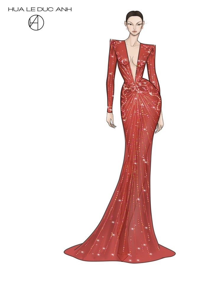 Thiết kế màu đỏ lấy cảm hứng từ "ngọn lửa của người phụ nữ Việt Nam" - vừa mạnh mẽ, kiêu hãnh, vừa mềm mại, uyển chuyển. Tông đỏ ruby tượng trưng cho sức mạnh nội tại và sự quyết liệt trên hành trình chinh phục vương miện Miss Universe. Được biết, êkíp ước tính bộ trang phục có giá hơn 100 triệu đồng.