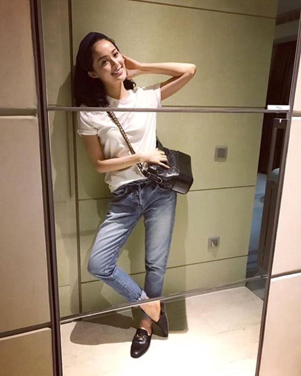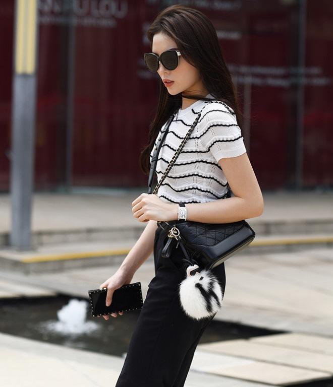 Hạ Vi ăn mặc đơn giản để tôn vinh chiếc túi xách xa hoa làm điểm nhấn cho set đồ.