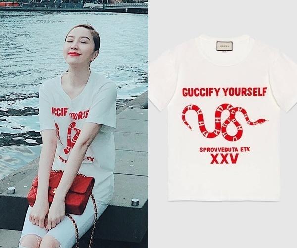 Dù không khoa trương nhưng Bảo Thy cũng là một trong những tay chơi hàng hiệu thứ thiệt của Vbiz. Bên cạnh túi xách hay giày dép thì nữ ca sĩ cũng sở hữu những mẫu áo phông hiệu đắt đỏ. Trong chuyến đi du lịch Úc cách đây chưa lâu, cô đã khoe hàng loạt những bộ cánh đẳng cấp. Diện áo phông cùng quần jean ton sur ton, cô khéo léo nhấn nhá thêm phụ kiện là túi xách đỏ nổi bật. Trong đó, mẫu áo phông in hình rắn này trị giá $620 ~ 14 triệu VND đồng và nó thuộc hiệu Gucci.