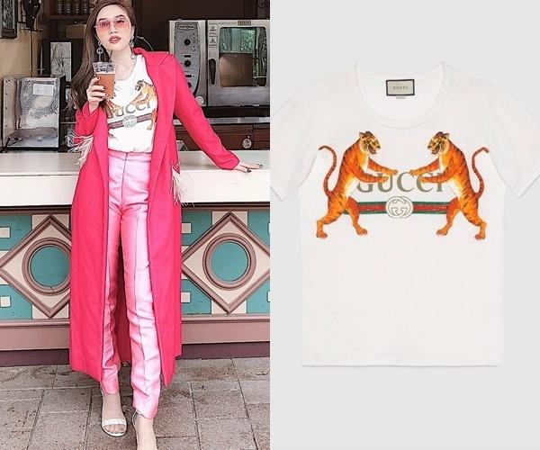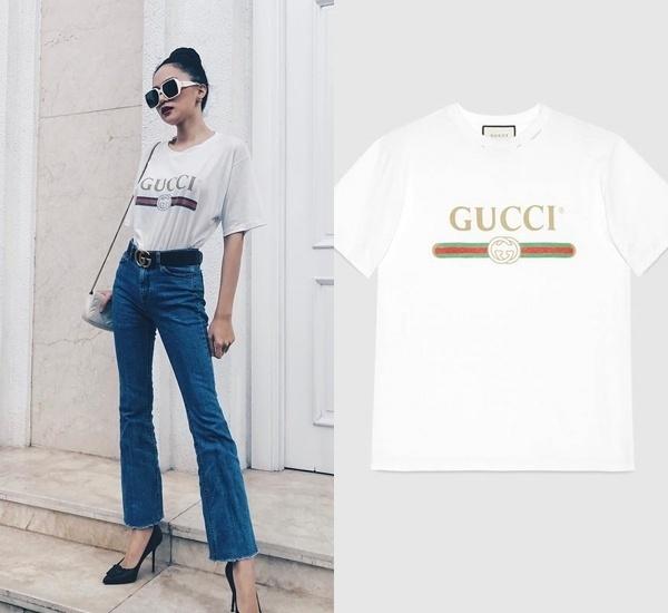 Tiếp tục là một mẫu áo phông đắt đỏ được Hoa hậu bổ sung cho BST hàng hiệu của mình. Đó là một thiết kế màu trắng của Gucci và nó trị giá $590 ~ 13,5 triệu đồng.