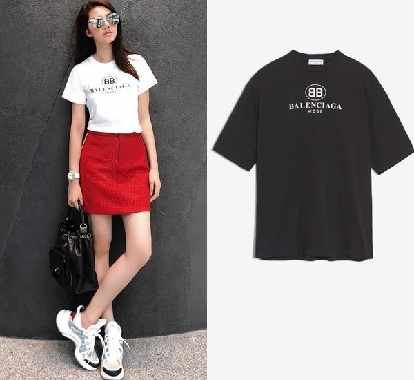 ''Tiểu thư con nhà giàu'' Jolie Nguyễn luôn khiến cho người khác phải ngưỡng mộ bởi cuộc sống xa hoa cùng sở thích dùng hàng hiệu của mình. Cô cũng thường lựa chọn những mẫu áo phông đắt giá để giúp những bộ cánh dạo phố của mình thêm sành điệu thời thượng. Mix chân váy đỏ cùng áo phông trắng và thêm phụ kiện là túi xách, giày thể thao thô kệch, mỹ nhân này đã có ngay một set đồ trẻ trung mà hợp gu. Mẫu áo phông mà cô diện là của nhà mốt Balenciaga trị giá $430 ~ gần 10 triệu đồng.