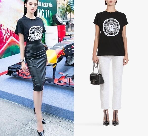 Diện cả cây đen chất lừ gồm áo phông kết hợp cùng chân váy da và giày cao gót, cô khoe phong cách sang chảnh cùng vẻ sexy thời thượng. Mẫu áo phông này trị giá €219 ~ 6 triệu đồng.