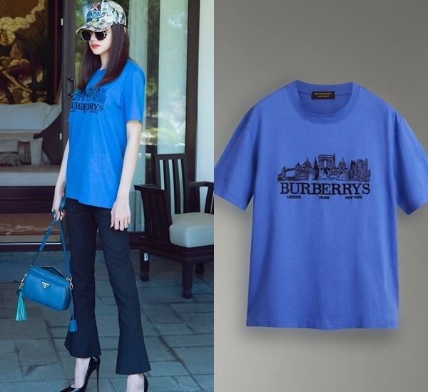 Trong cuộc đua diện áo phông hiệu không thể không kể đến Hoa hậu chuyển giới quốc tế 2018 Hương Giang. Mỹ nhân này yêu thích kiểu áo phông xanh biển in logo của thương hiệu Burberry trị giá $380 ~ gần 9 triệu đồng.