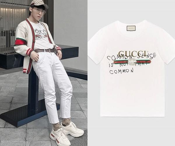 Bên cạnh việc là một ca sĩ tài năng với gu âm nhạc cá tính, Sơn Tùng MTP còn được mến mộ bởi phong cách thời trang đẳng cấp hệt như những fashionista đích thực. Ngày càng khẳng định mình trong bản đồ thời trang Vbiz, anh chàng ca sĩ gốc Thái Bình được coi là một nhân tố đột phá, một biểu tượng thời trang mới được giới trẻ học tập và noi theo. Cũng yêu thích dòng áo phông trắng của Gucci, anh chàng này lựa chọn item in slogan Common sense is not that common. Thiết kế này trị giá $ 600 ~ 14 triệu đồng.