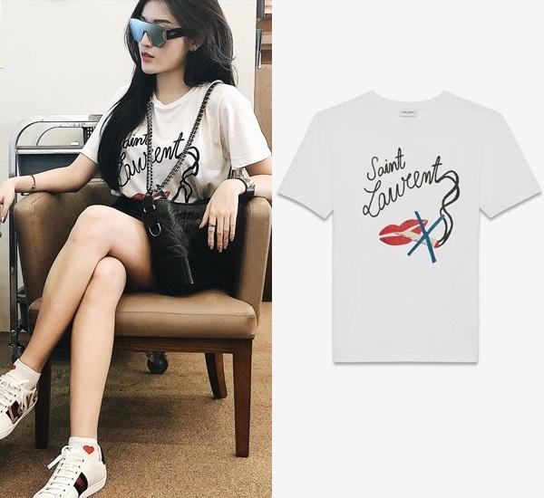 Huyền My yêu thích mẫu áo phông trắng in logo thương hiệu của Saint Laurent và nó trị giá $734 CAD ~ 13 triệu đồng.