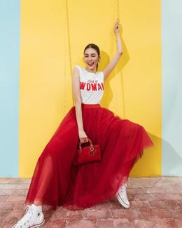 Nữ người mẫu phối đồ đồng điệu cùng túi xách Dior Lady D-Joy, có giá 3.400-9.900 USD (81-235,8 triệu đồng) tùy kích cỡ, màu sắc và chất liệu (Ảnh: @tranngoclankhue).