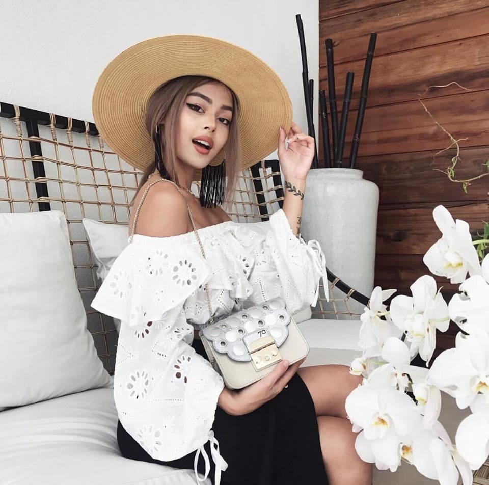 Kiểu đồ yêu thích của cô nàng này là những bộ đồ gợi cảm, tôn dáng, toát lên vẻ sang chảnh. Lily diện áo trễ vai - item đinh mùa hè kết hợp chân váy và túi hiệu Furla.