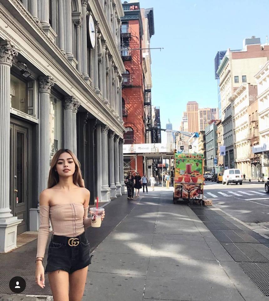 Lily Maymac diện streetstyle xuống phố với áo trễ vai và short jean, "ăn gian" chiều cao mà vẫn vô cùng sành điệu.