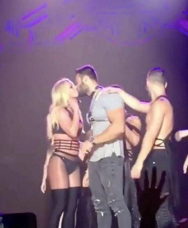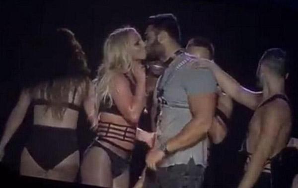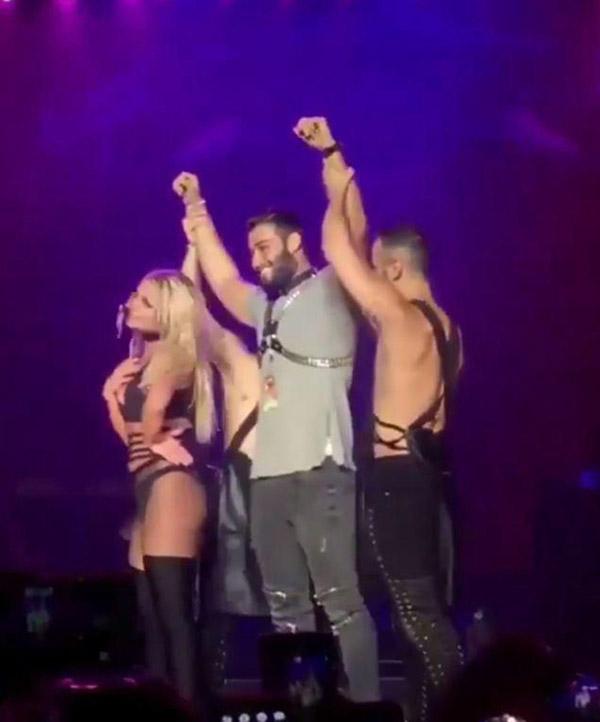 Trong show này, nữ ca sĩ giới thiệu với các fan xứ Đài bạn trai của cô - người mẫu 23 tuổi Sam Asghari. Anh chàng bị các vũ công trói tay và dẫn lên sân khấu để pha trò cùng Britney.