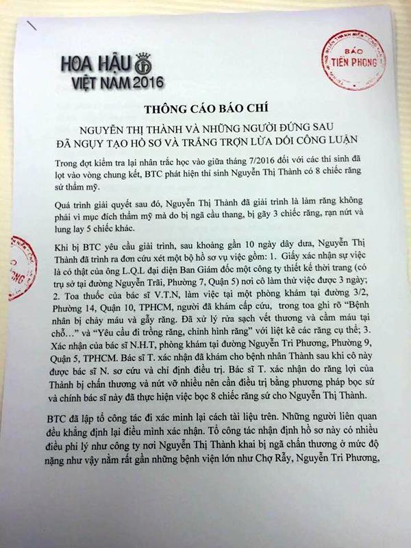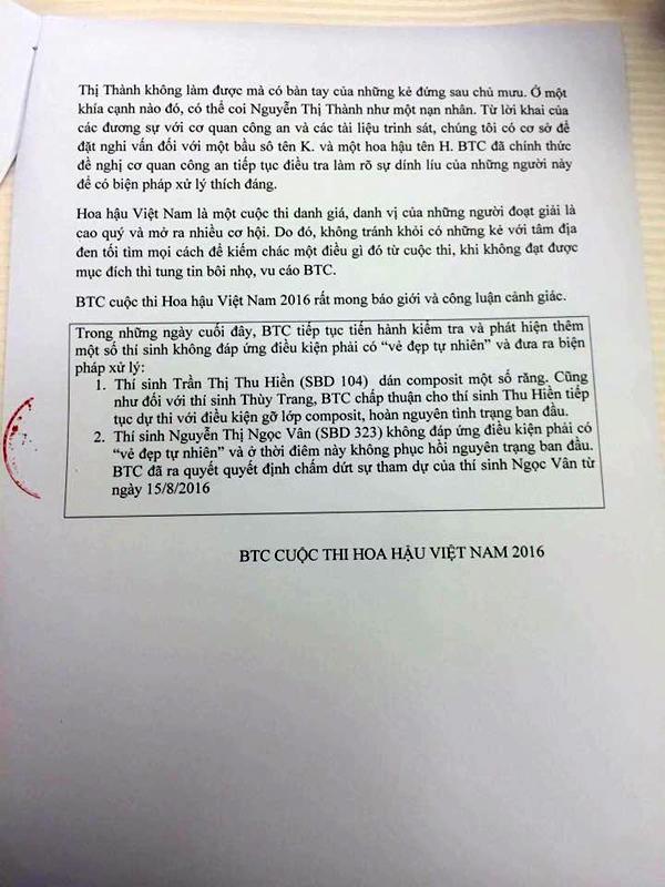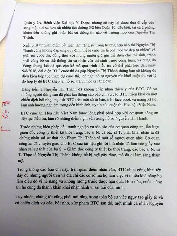 Đáng tiếc là Nguyễn Thị Thành đã không chấp nhận thiện ý của BTC. Cô và những người đứng sau đã phát tán thông cáo báo chí vu cáo BTC, triển khai cả một chiến dịch bôi nhọ BTC trên một số tờ báo, trên facebook và mạng xã hội, làm ảnh hưởng nghiêm trọng đến hình ảnh, uy tín của cuộc thi Hoa hậu Việt Nam. BTC cuộc thi Hoa hậu Việt Nam buộc lòng phải phối hợp với cơ quan công an tiếp tục điều tra, làm rõ những điểm nghi vấn trong hồ sơ Nguyễn Thị Thành.