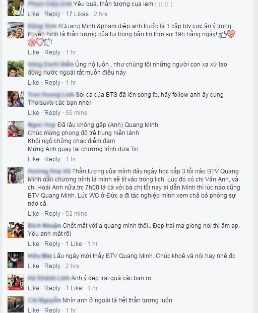 BTV Diệp Anh – người bạn dẫn ăn ý của BTV Quang Minh trong Bản tin thời sự 19h cũng chia sẻ đoạn clip với những lời bình luận dí dỏm. Cô gọi BTV Quang Minh là “soái ca”, “thần tượng” nhưng không quên bắt lỗi nam MC khi anh mặc một chiếc áo kẻ lên hình.