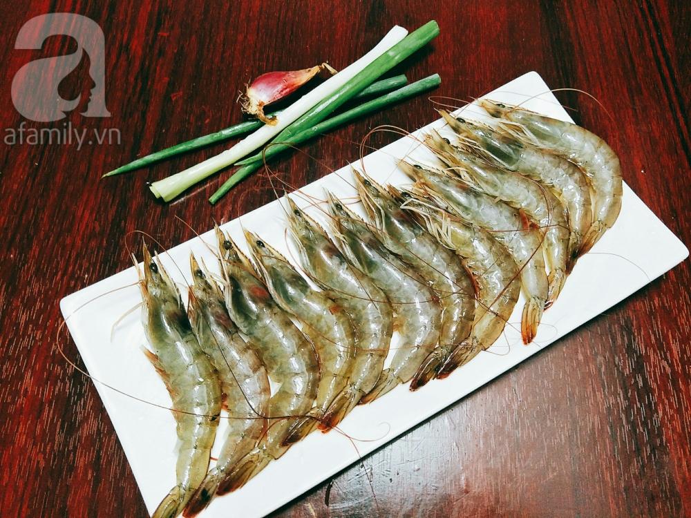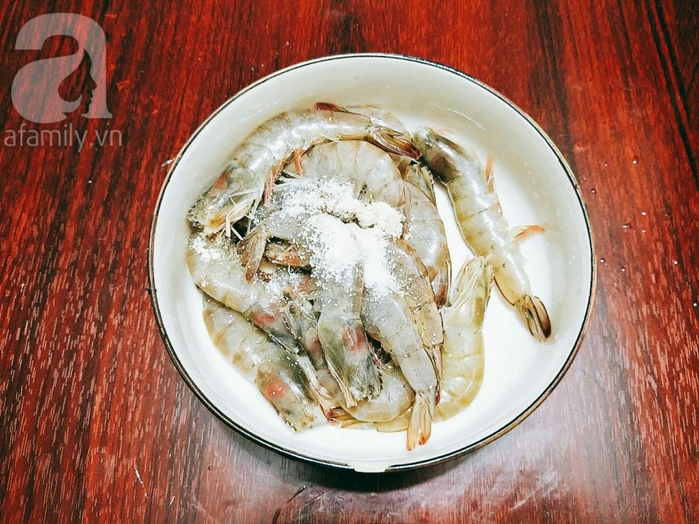 Tôm rửa sạch rồi cắt bỏ phần đầu nhọn và dâu tôm sau đó ướp tôm với 1 chút muối, bột nêm, tiêu và trộn đều.