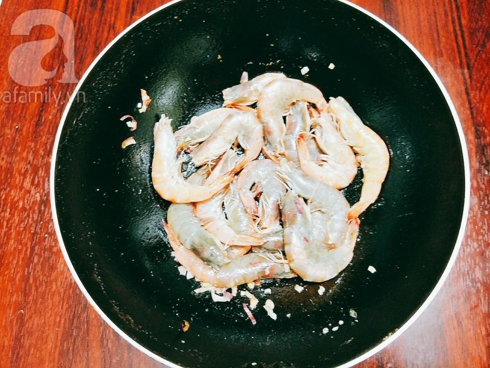 Cho 2 thìa dầu ăn vào chảo đun cho nóng dầu sau đó cho hành băm vào phi thật thơm mới cho tôm vào xào.