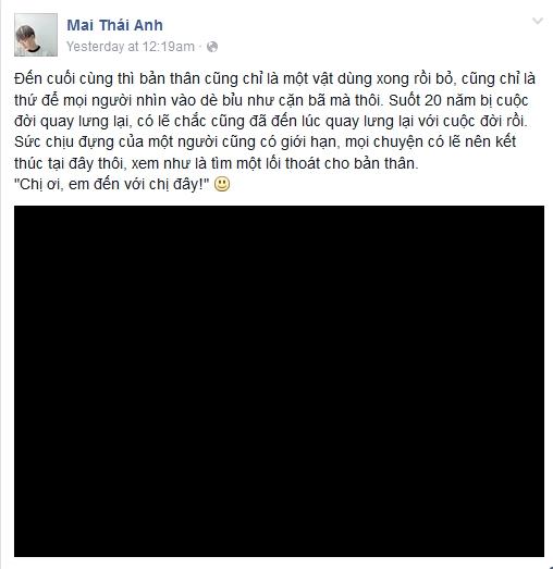 Hôm qua, Mai Thái Anh bất ngờ đăng tải lên trang facebook cá nhân những dòng nhắn nhủ như một bức thư tuyệt mệnh, anh viết: