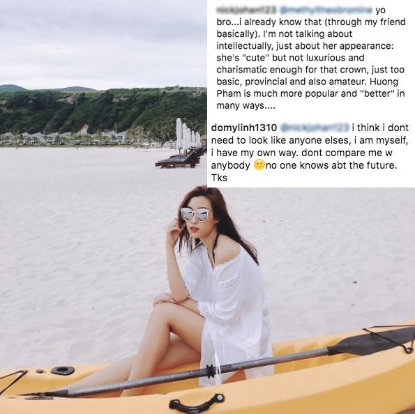 Cách đây ít ngày, hoa hậu Mỹ Linh cũng vướng phải ồn ào trên mạng xã hội. Cụ thể, hôm 3/7 vừa qua, mỹ nhân họ Đỗ đăng tải khoảnh khắc đẹp bên bờ biển trong kỳ nghỉ hè trên Instagram cá nhân. Bên cạnh lời khen về nhan sắc, một người nước ngoài đã nhận xét ngôi sao họ Đỗ không thật sự nổi tiếng như đàn chị Phạm Hương.