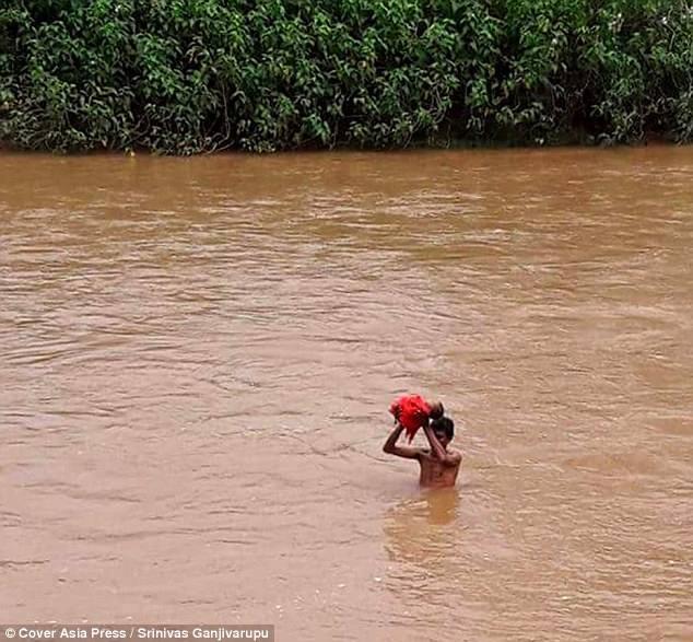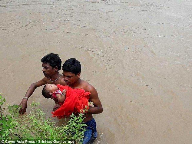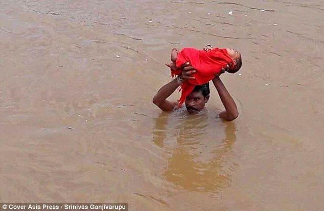 Mới đây, mưa lớn và lũ lụt đã khiến ngôi làng Kudumusare, bang Andhra Pradesh, phía Tây Nam Ấn Độ bị cô lập với thế giới bên ngoài. Mọi ngả đường tới thị trấn hay bệnh viện đều bị chặn đứng bởi dòng nước lũ, trong khi đó, gia đình cũng không có tàu thuyền gì để di chuyển, chẳng còn cách nào khác, anh Pangi Satiabu (30 tuổi) đã quyết định đưa con gái vượt qua dòng nước lũ để tới trung tâm y tế.