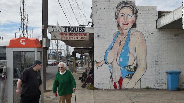 Nghệ sĩ đường phố Lushsux đã vẽ nữ ứng cử viên Tổng thống Mỹ, bà Hillary Clinton trong một bộ đồ bơi in cờ Mỹ, ngay giữa đường phố Melbourne, Úc.
