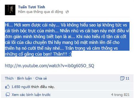 Không chỉ vậy, nội dung của đoạn clip còn có nhiều ám chỉ sâu xa khác liên quan tới việc chàng ca sĩ mới nổi tận dụng lượng fan lớn của mình để quảng bá cho các thương hiệu đang bị tẩy chay trên cộng đồng mạng. Ngay sau khi được tung lên, clip đã có gần ngàn lượt view và hàng ngàn người like sau chỉ vài ngày. Tất nhiên, "nhân vật chính" của đoạn clip không thể không hay biết về điều này và ngay hôm qua, anh đã gửi lời nhắn nhủ tới tác giả của màn chỉ trích mình bằng lời lẽ khá nhẹ nhàng nhưng không kém phần ... cay cú.