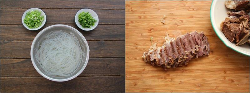 Trụng bún qua nước sôi để khi ăn giữ được độ nóng. Chuẩn bị hành ngò băm nhuyễn. Thịt bò vớt ra, để ráo rồi cắt lát mỏng vừa ăn.