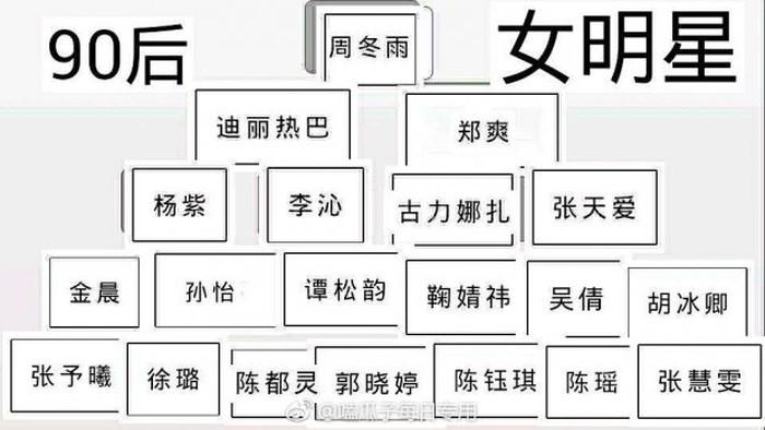 Nằm trong BXH sinh sau năm 1990 là những nữ diễn viên rất nổi tiếng trong giới trẻ. Dẫn đầu là Châu Đông Vũ - nữ diễn viên chuyên trị vai nữ chính trong các bộ phim thanh xuân vườn trường, đồng thời cũng là ảnh hậu Kim Mã duy nhất trong bảng xếp hạng này. Tiếp sao đó là những diễn vên nội trội khác là mỹ nhân Tân Cương Địch Lệ Nhiệt Ba , cô gái thanh xuân Trịnh Sảng , Dương Tử , Lý Thấm , Cổ Lực Na Trát , Trương Thiên Ái … những diễn viên có độ nổi tiếng gần đây rất cao. Điều bất ngờ hơn, Địch Lệ Nhiệt Ba chỉ vừa nổi tiếng trong 2 năm trở lại đây, thế nhưng vị thế lại cao hơn so với nữ thần thanh xuân Trịnh Sảng và những nữ diễn viên 9x khác được đánh giá là diễn xuất “trên cơ” cô nàng. Nhiều cư dân mạng mỉa mai nhận xét, có lẽ Gia Hành đã nhúng tay vào bảng xếp hạng này nên mới có nhiều gà nhà có thứ hạng cao đến vậy!