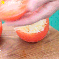 - Cắt đôi, khoét bỏ ruột ở nửa dưới quả cà chua còn nửa trên vẫn để nguyên.