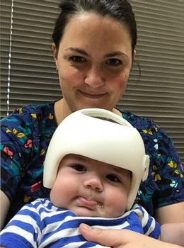 Do bị méo đầu, bé Jonas Gutierrez (4 tháng tuổi, sống tại Texas, Mỹ) phải nhờ đến sự trợ giúp của chiếc mũ bảo hiểm trong khoảng từ 3-6 tháng.