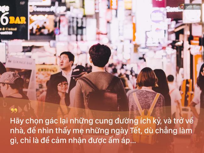 Thế nhưng, Tết Nguyên đán cũng chỉ mỗi năm mới có một lần, ấy vậy mà vẫn nhiều người trẻ chọn cách lên đường vào mỗi dịp nghỉ Tết. Họ bỏ lại sau lưng những giá trị truyền thống "uống nước nhớ nguồn", những niềm vui sum vầy, đoàn viên sau một năm vất vả. Họ bỏ lại cha mẹ đau đáu ngồi trước thềm nhà, chờ con về ăn một bữa cơm sum họp. Họ bỏ lại người thân với lời chúc an lành dang dở, bao lì xì hờ hững trên tay không biết trao ai...