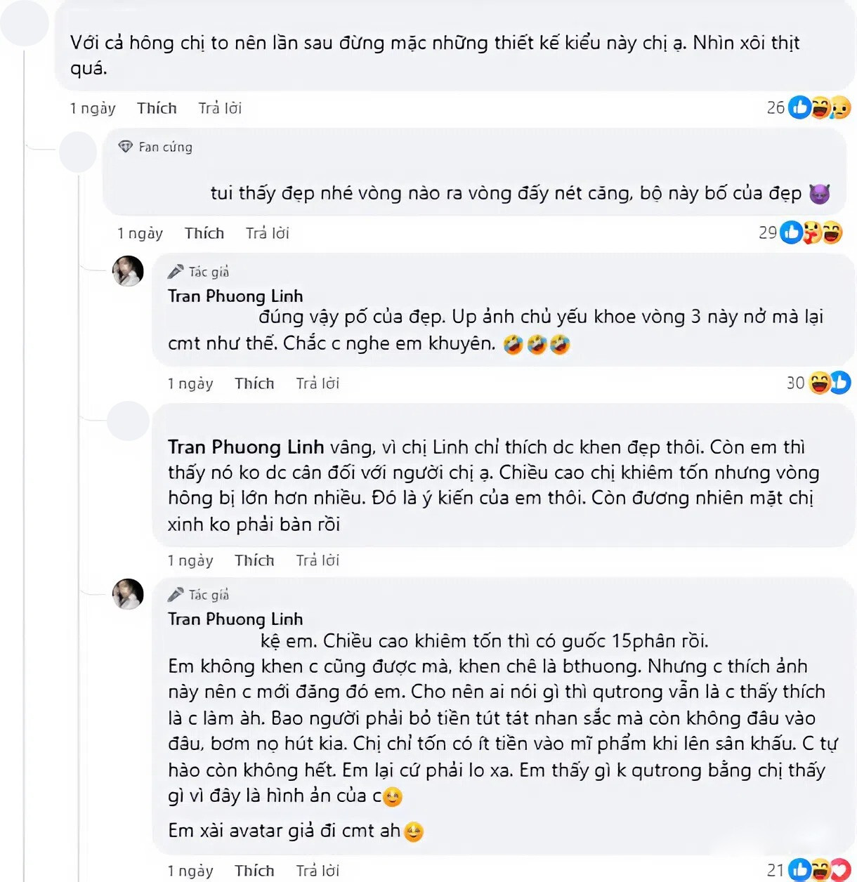 Khi tiếp tục nhận được 1 bình luận là: “Chị Linh chỉ thích được khen đẹp thôi, còn em thì thấy nó không cân đối với người ạ. Chiều cao chị khiêm tốn nhưng vòng hông bị lớn hơn nhiều. Còn đương nhiên mặt chị xinh không phải bàn rồi”.