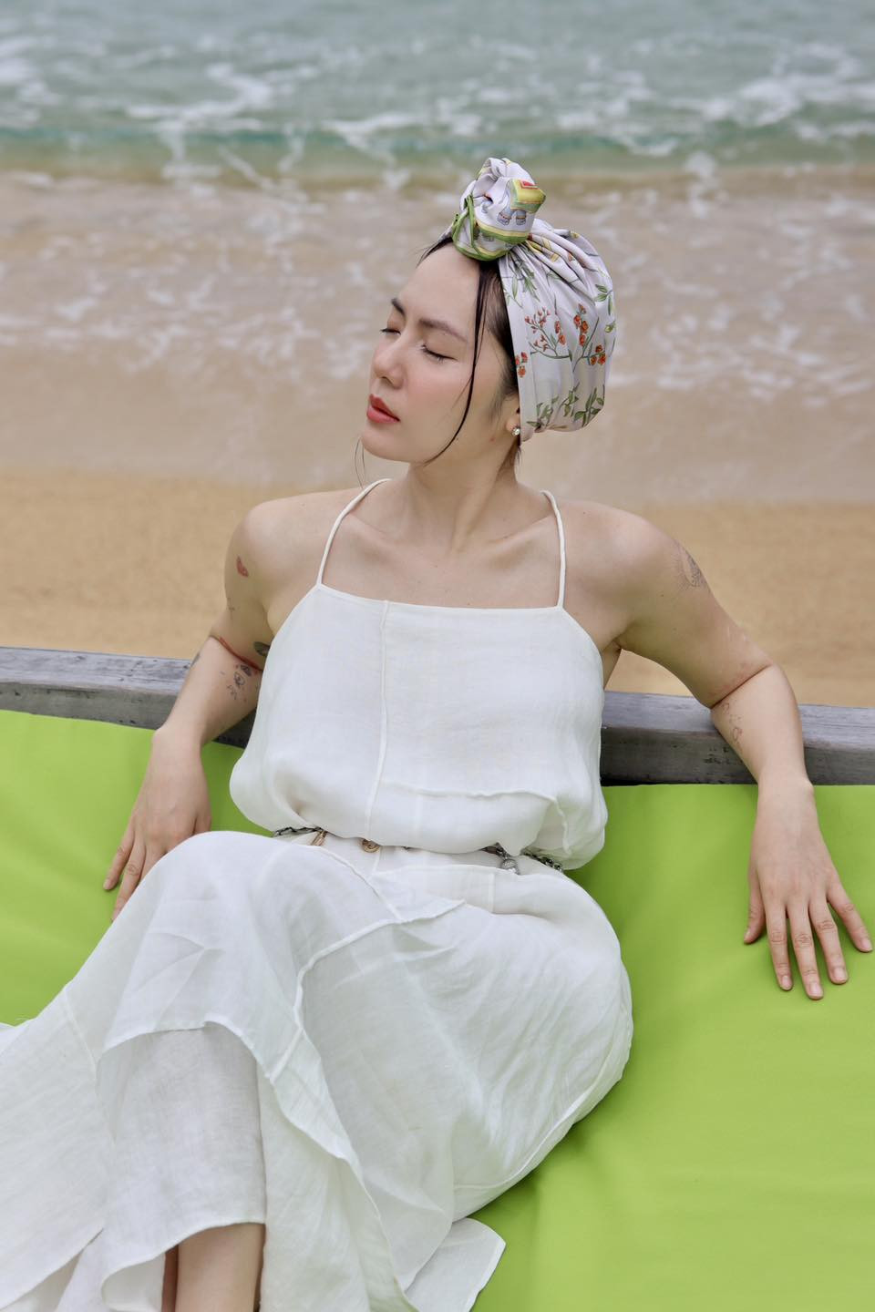 Thân hình 'mình hạc xương mai' của nữ ca sĩ được tôn lên nhờ chiếc khăn được cách điệu thành áo quây trễ nải mix chân váy lụa.