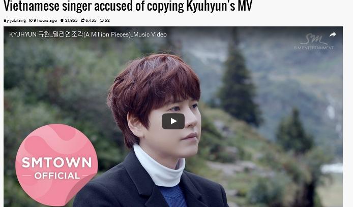 Hôm qua 11/4, chuyên trang thông tin về Kbiz - Allkpop đã đưa tin một nghệ sĩ Việt Nam bị cư dân mạng tố là đạo MV của Kyuhyun. Sản phẩm copy-cat A Million Pieces của Kyuhyun là MV Đêm Không Còn Em của Dương Hiếu Nghĩa được phát hành vào đầu tháng 4.