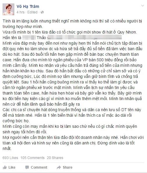 Chia sẻ của Võ Hạ Trâm trên trang cá nhân vì bị bầu show "xù" tiền.