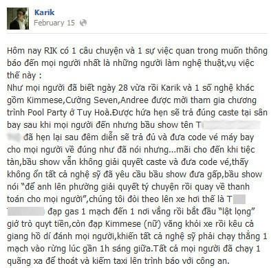 Không chỉ bị quản lý của mình quỵt tiền mà Karik còn bị bầu show lật lọng và hành hung ngay sau đêm diễn vào năm 2013. Sự việc từng được Karik thuật lại trên facebook cá nhân khiến nhiều người hâm mộ vô cùng lo lắng và bức xúc về tính giang hồ của bầu show. Ngoài việc bị quỵt tiền, Karik và các nghệ sĩ đi cùng như Kimmese, Cường Seven, Andree còn phải tự bỏ tiền túi ra để trả tiền khách sạn, vế tàu xe, các khoản ăn ở chi phí khác.