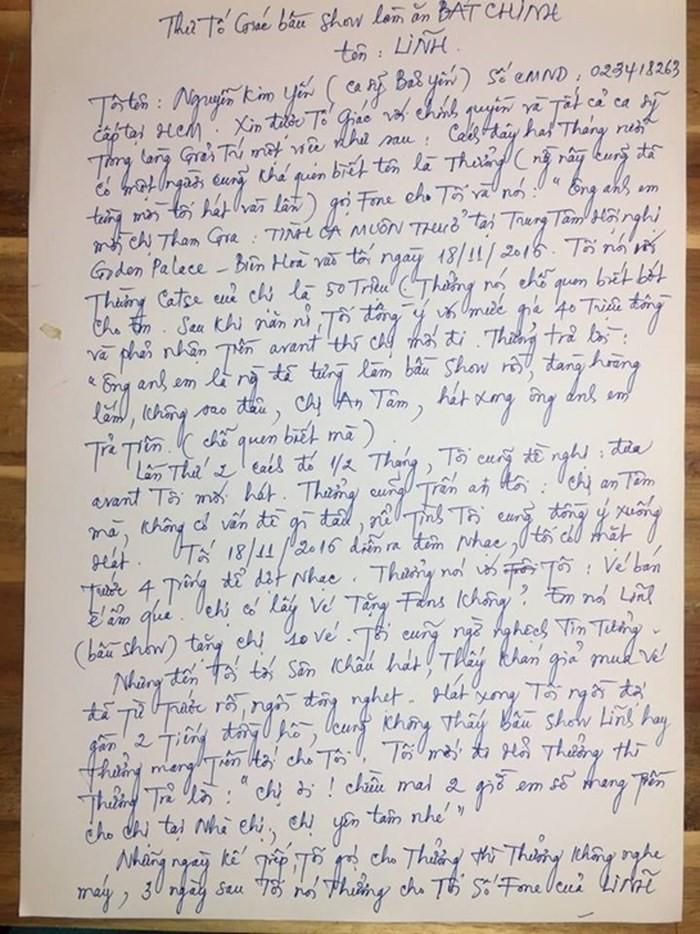Lá đơn tố giác ông bầu quỵt tiền của danh ca Bảo Yến.