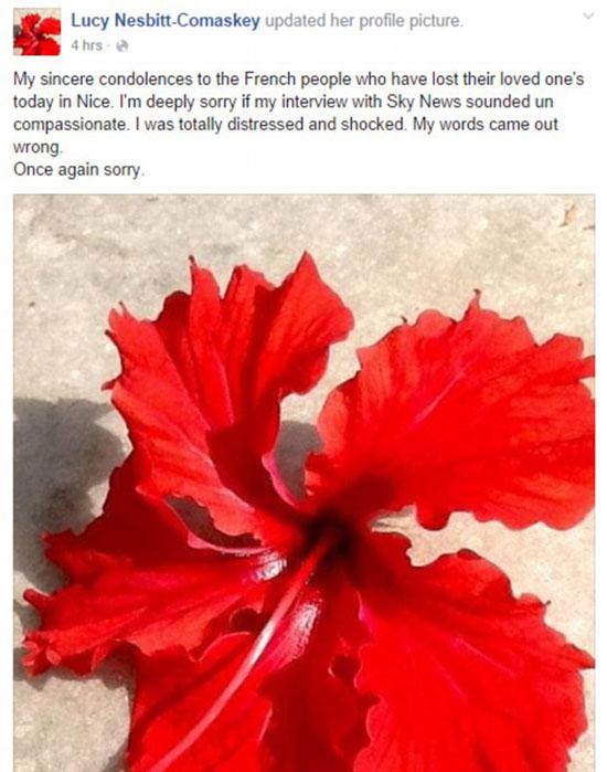 Trước phản ứng dữ dội của dư luận, vào sáng ngày 15/7, Lucy đã gửi lời xin lỗi của mình tới nước Pháp trên trang Facebook cá nhân. Lucy thanh minh rằng lúc đó mình rất sốc khi phải chứng kiến cảnh tượng kinh hoàng nên có lỡ lời với phóng viên. Dù sao, một lần nữa cô cũng muốn gửi lời xin lỗi và lời chia buồn sâu sắc nhất tới toàn thể nước Pháp.
