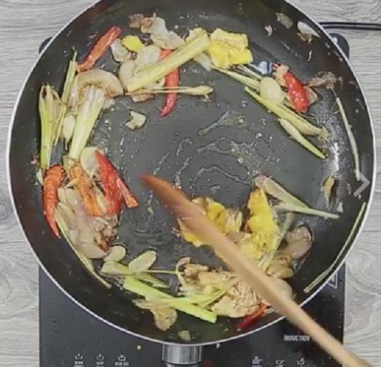 Bước 2: Cho gừng và sả đập dập, ớt vào phi cùng