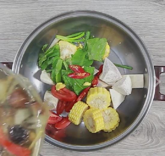 Bước 5: Trong một cái nồi khác, cho ngô ngọt, khoai môn, mùi tàu, ớt, bơ, cà chua, hành lá và thìa canh rượu trắng vào